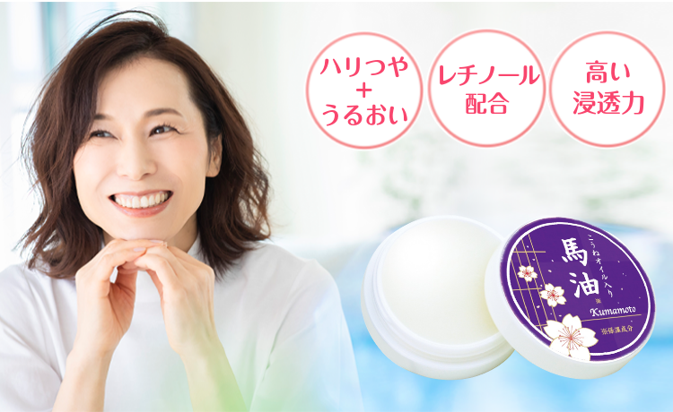 こうねオイル入り馬油には、馬のタテガミ下にある油の「こうね」を入れています。こうねは全体の4%しかとれない希少で高価な成分で、美容成分であるレチノールが天然のまま豊富に含まれています。レチノールは、コラーゲンやヒアルロン酸の生成を助ける働きがあるため、ハリ・弾力のある若々しい肌へと導きます。