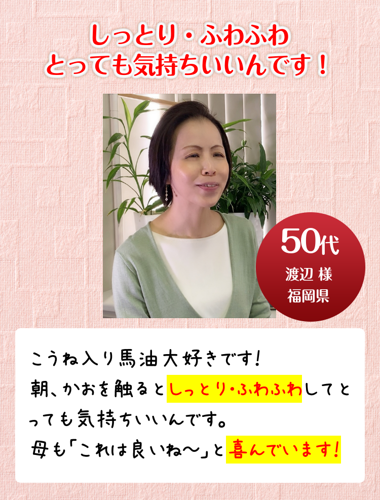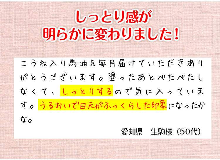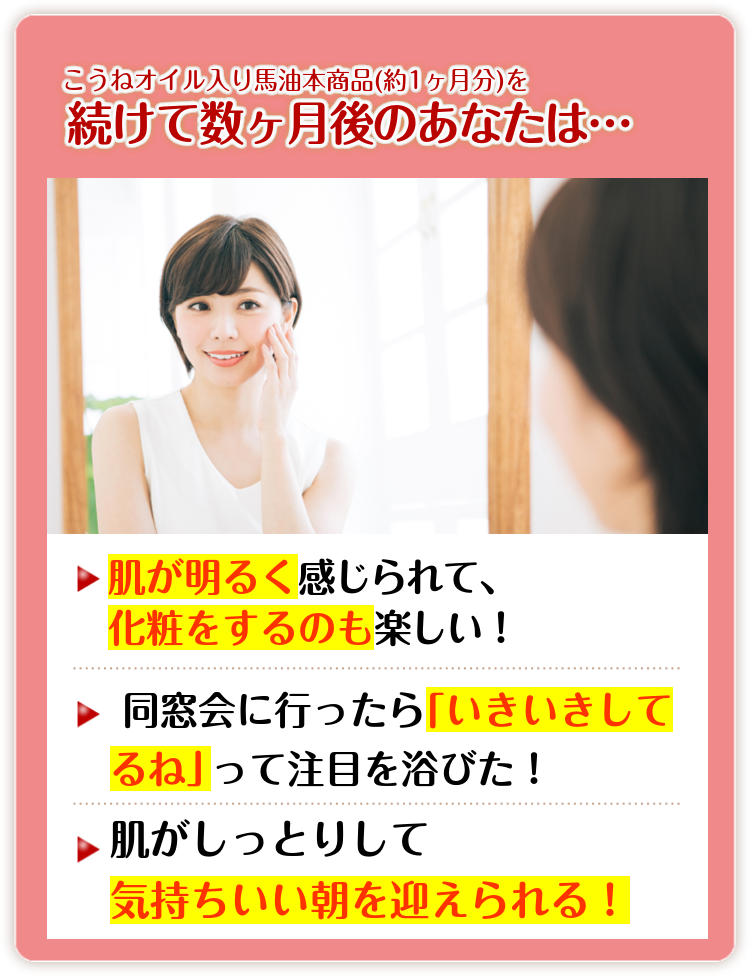 年齢に負けないつややか潤い肌を 手に入れるためには 忙しい生活の中でも継続して、 こうねオイル入り馬油を 使用することが重要です。