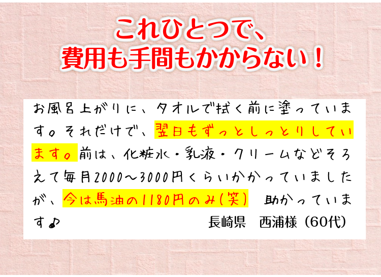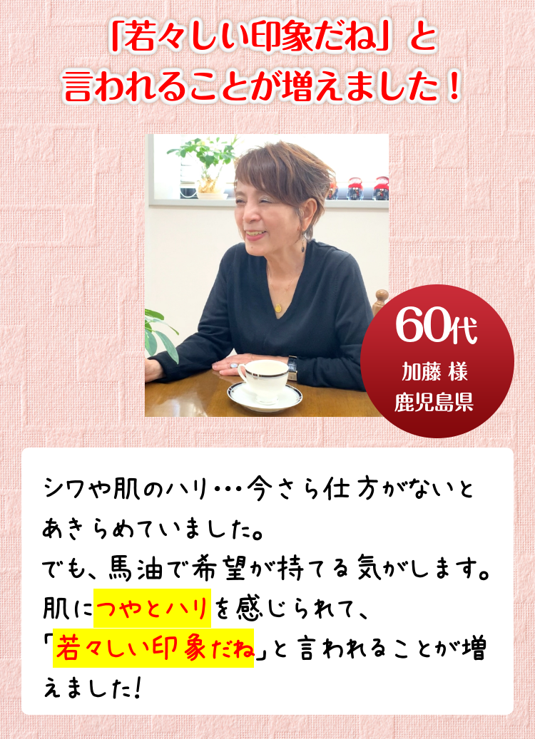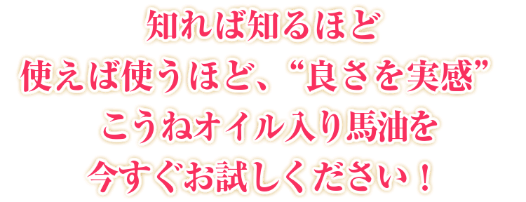 ぜひ一番お得な、 この機会に こうねオイル入り馬油で 年齢に負けないつややか潤い肌を 手に入れて 素晴らしい人生を 送りましょう!