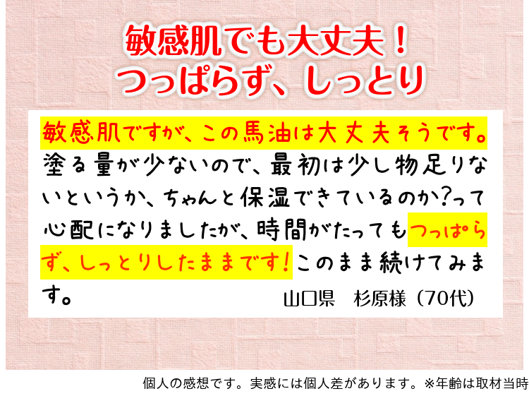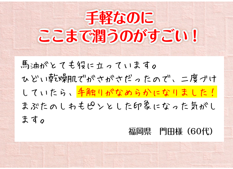 レベルの高い、特別な馬油です。 3つのこだわりで、 年齢に負けない