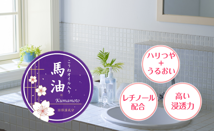 お風呂上がりや洗顔後は、肌がたっぷりの水分を含んでいるため、こうねオイル入り馬油をなじませるだけ!濡れたままの状態なら、化粧水なしで大丈夫です。馬油が皮脂膜の代わりとなり、水分をぎゅっと閉じ込めて、肌の内側から潤うみずみずしいつや肌を実現します。